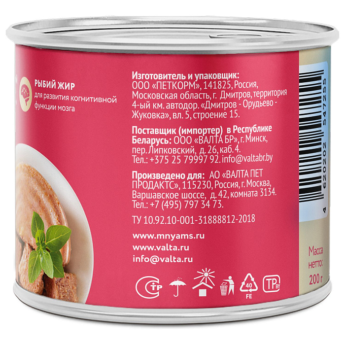 Состав: телятина (не менее 35%), индейка (не менее 30%), витамины и минералы, рыбий жир.
