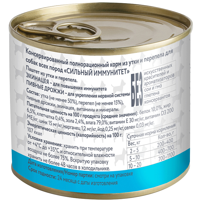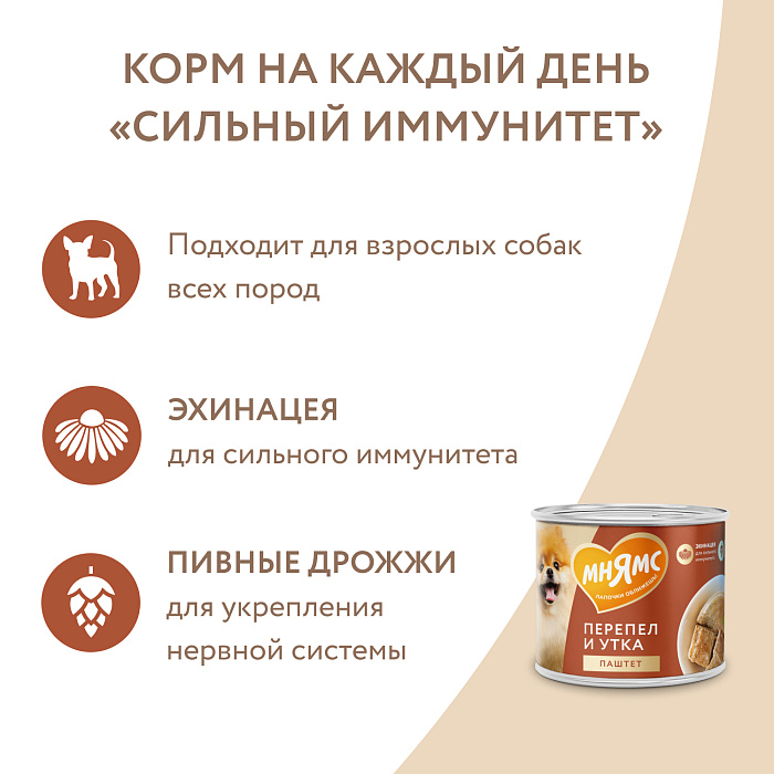 Собаки, живущие в большом городе, также, как и люди, подвержены неблагоприятному воздействию окружающей среды и стрессу. Именно поэтому паштет из утки и перепела не только очень сытный и вкусный, но и содержит эхинацею и пивные дрожжи для повышения иммунитета и укрепления нервной системы. Заботьтесь о своей собаке правильно вместе с «Мнямс».