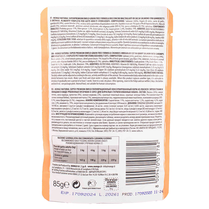 Monge (Монж) Cat BWild GRAIN FREE (холистик) полнорационные беззерновые паучи из лосося с креветками и овощами для стерилизованных кошек и кастрированных котов 85 г.