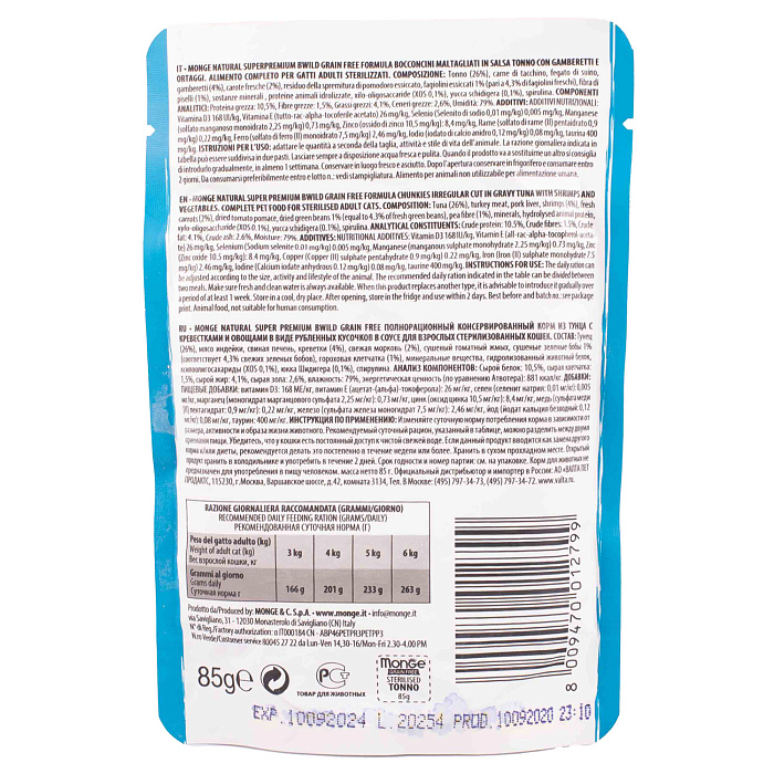 Monge (Монж) Cat BWild GRAIN FREE (холистик) полнорационные беззерновые паучи из тунца с креветками и овощами для стерилизованных кошек и кастрированных котов 85 г.