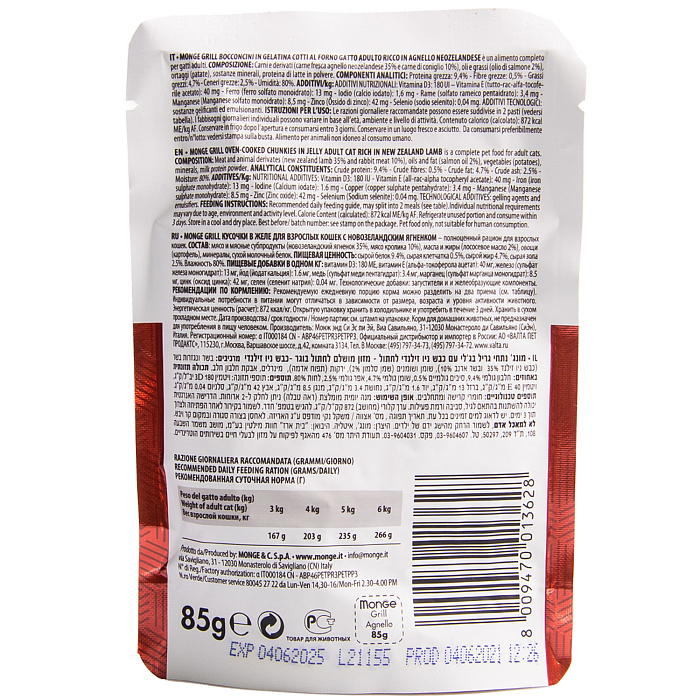 Monge (Монж) Cat Grill полнорационные беззерновые паучи из новозеландского ягненка для взрослых кошек и котов 85 г.