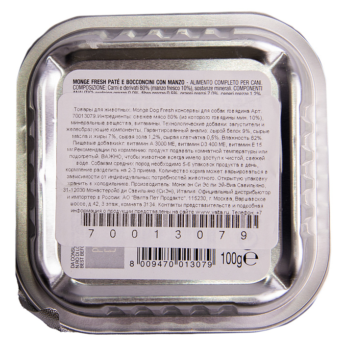 Monge (Монж) Dog Fresh полнорационный влажный корм с мясом говядины для взрослых собак всех пород 100 г.