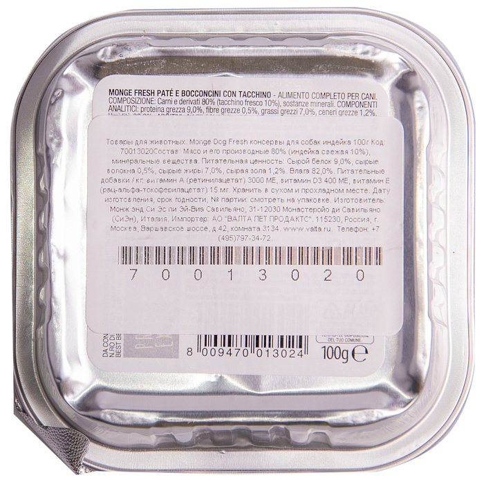 Monge (Монж) Dog Fresh полнорационный влажный корм с мясом индейки для взрослых собак всех пород 100 г.