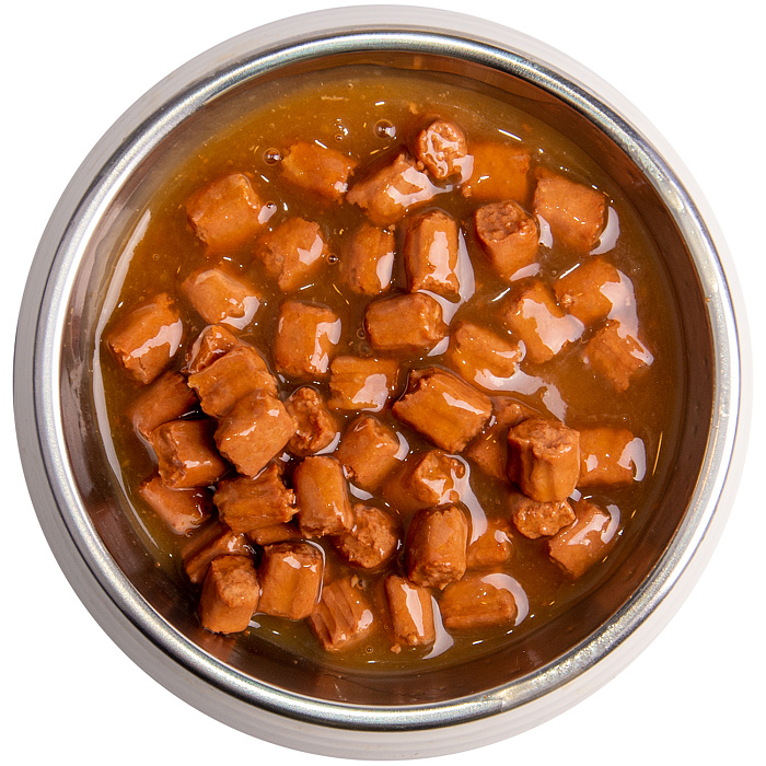 Нежные кусочки в аппетитном соусе из отборных ингредиентов высокого качества с лососем для взрослых собак всех пород.