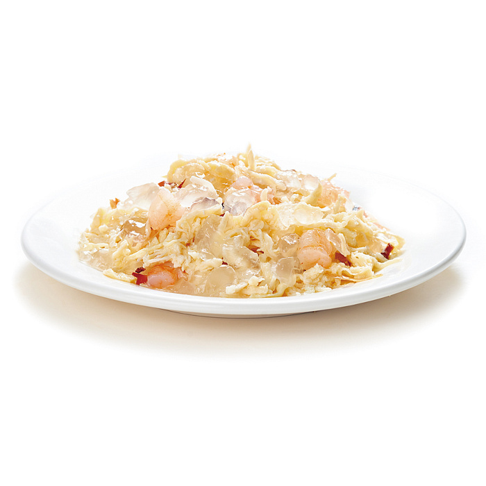 Курица, креветки, крахмал, каррагинан, соль, олигосахариды, таурин, экстракт чая, витамины (A, B2, B3, B5, D3, E), карбонат кальция Питательная ценность в 100 г (среднее значение): сырой белок 9%, сырой жир 0,1%, сырая клетчатка 0,5%, сырая зола 1,5%, влага 88%.