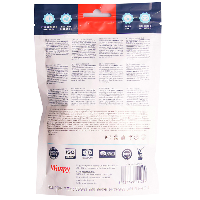 Белки (мин) 48%, Жиры (мин) 3,5%, Клетчатка (макс) 0,3%, Зола (макс) 3,5%, Влажность (макс) 35%. Ингредиенты: курица, глицерин, экстракты из морепродуктов.