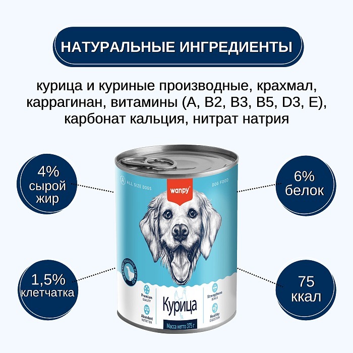 Wanpy Dog консервы для собак из курицы - это высококачественный сбалансированный корм, который обеспечит вашего питомца необходимыми витаминами и минералами.
