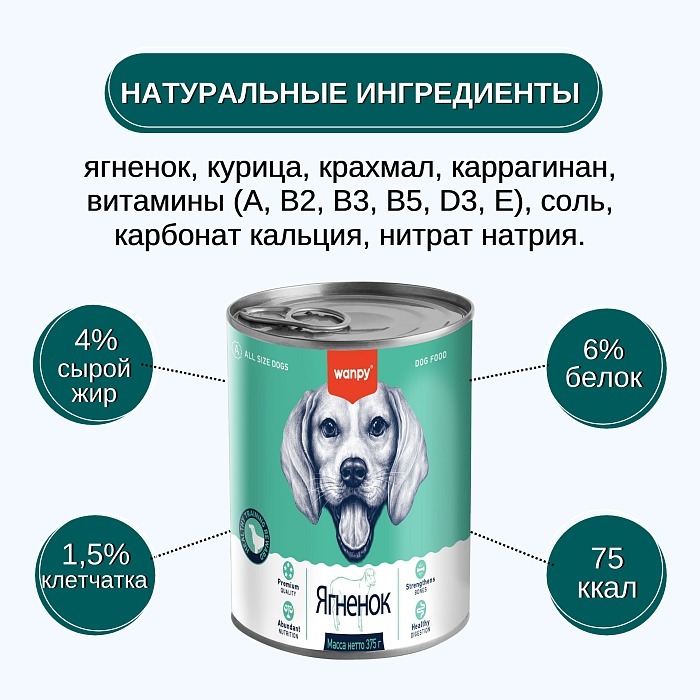 Wanpy Dog консервы для собак из ягненка - это высококачественный сбалансированный корм, который обеспечит вашего питомца необходимыми витаминами и минералами.
